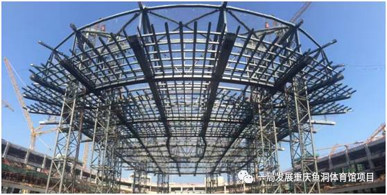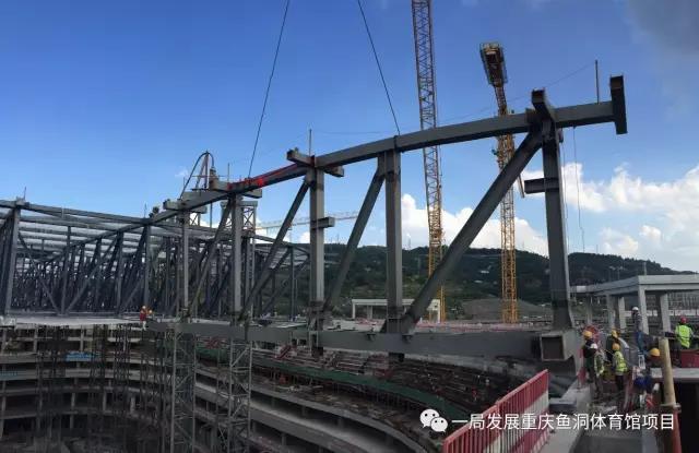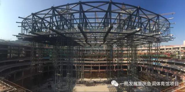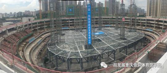 重慶華熙LIVE·魚洞體育館項(xiàng)目作為西南地區(qū)最大的綜合體育場館,屋蓋平面形狀為圓角矩形(接近橢圓形),短跨方向109.2m,長跨方向126m,采用雙向交叉平面鋼桁架結(jié)構(gòu), 鋼桁架底部標(biāo)高為+24.900m,桁架頂部標(biāo)高+33.540m,鋼屋蓋通過周邊36個(gè)鋼鉸支座支撐于下部鋼骨混凝土結(jié)構(gòu)上,整個(gè)體育館鋼結(jié)構(gòu)用鋼量約4500噸。通過多種施工方案對(duì)比分析,最終確定屋蓋鋼結(jié)構(gòu)采用中心區(qū)液壓整體提升技術(shù)配合外環(huán)650噸大型履帶吊分段吊裝施工技術(shù);中心區(qū)提升重量達(dá)1300噸;外環(huán)主桁架共計(jì)36榀,每榀鋼桁架跨度約22米,重量約27噸,外環(huán)總重量達(dá)1600噸。