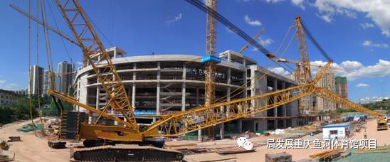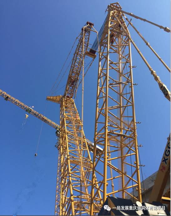 650噸大型履帶吊7月13日進(jìn)場開始組裝,歷時(shí)9天組裝完成并通過驗(yàn)收。650噸吊車采用42米主臂加96米副臂,帶超起的工況組合。最大吊裝半徑達(dá)105米,末端最大吊重可達(dá)35噸。組拼完成后自立高度可達(dá)120米,高度約為現(xiàn)場塔吊自立高度的兩倍。吊車自重達(dá)600噸,吊裝構(gòu)件時(shí)附加超起配重后重量達(dá)到870噸。