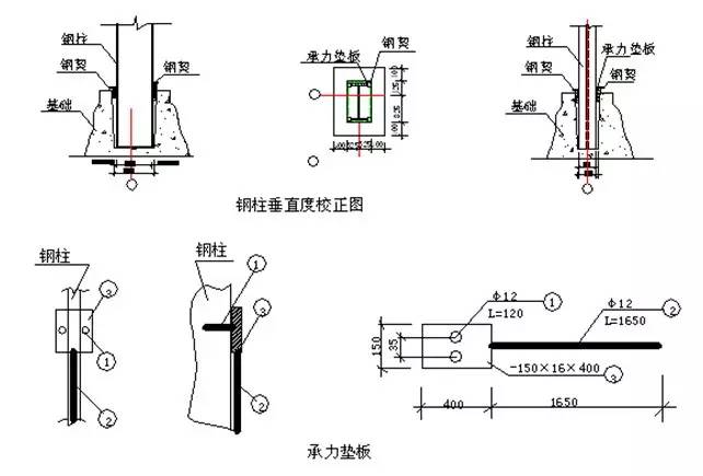 ·鋼柱垂直度校正:采用調(diào)距絲桿和鋼楔,由于柱子長(zhǎng)邊接觸面小,施工中設(shè)置墊板,詳圖如下。