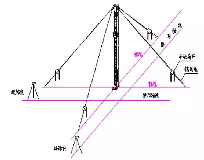 畢形成整體后即可插入測(cè)量校正。用兩臺(tái)經(jīng)緯儀從柱的兩個(gè)側(cè)面同時(shí)觀測(cè),使用攬風(fēng)繩進(jìn)行校正調(diào)整。
