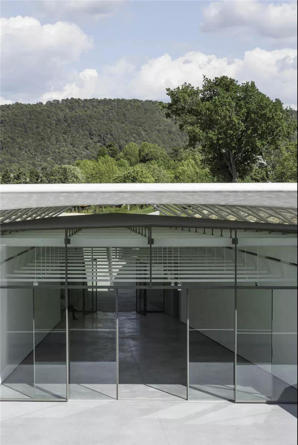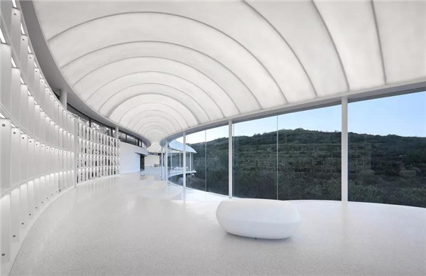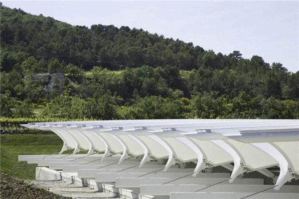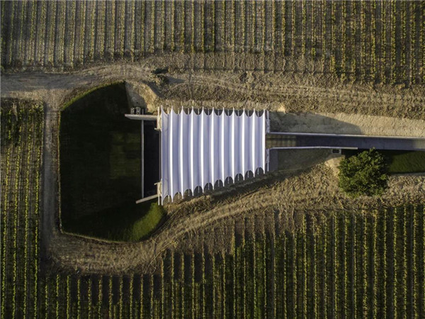 這個(gè)項(xiàng)目屹立在著名拉考特莊園的葡萄園的正中心。拱型結(jié)構(gòu)回應(yīng)了風(fēng)景畫(huà)般的葡萄園分布,仿佛是要把風(fēng)帆融入葡萄園。同時(shí)如同風(fēng)箏一般,風(fēng)帆飛揚(yáng)再落下,同時(shí)凸顯出建筑的輕盈和水平感。