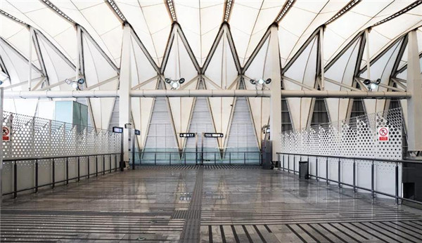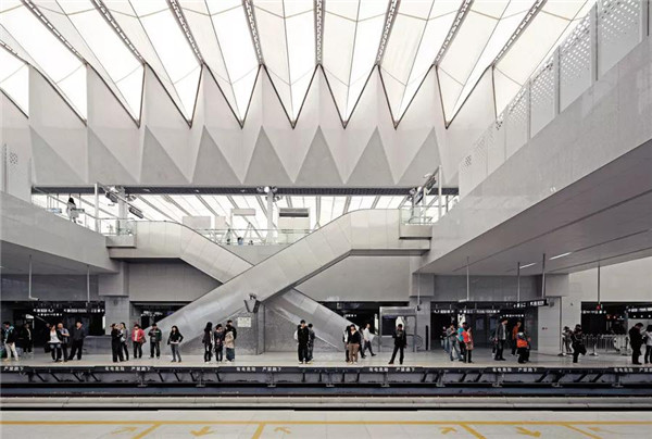 根據(jù)側(cè)式站臺(tái)的特征,車(chē)站采用了雙四邊形組合建筑斷面形式,并以PTFE膜結(jié)構(gòu)作為屋面和立面維護(hù)材料和結(jié)構(gòu),實(shí)現(xiàn)了內(nèi)部基本無(wú)柱的長(zhǎng)向大空間。