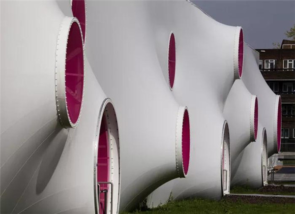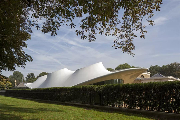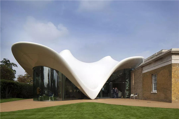 蛇形畫(huà)廊擴(kuò)建由扎哈.哈迪德(Zaha Hadid)操刀,餐廳外面的白色殼體是玻璃纖維編織的紡織膜,外膜是PTFE涂層玻璃纖維布,內(nèi)膜是有機(jī)硅涂層玻璃纖維布,外圈收口為玻璃鋼。