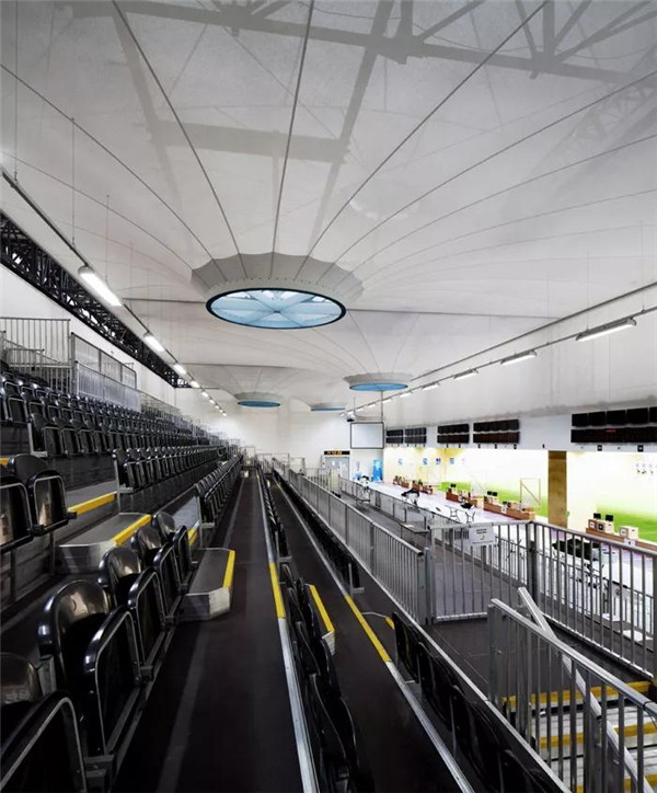 設(shè)計(jì)這項(xiàng)運(yùn)動(dòng),觀眾的肉眼很難看輕,因此設(shè)計(jì)的重點(diǎn)希望通過(guò)動(dòng)態(tài)的弧形空間表達(dá)出這個(gè)運(yùn)動(dòng)的動(dòng)態(tài)和精密。白色的膜外皮上面點(diǎn)綴著彩色的開(kāi)口,這些開(kāi)口是節(jié)點(diǎn),也可以消解風(fēng)壓,并為場(chǎng)地通風(fēng),也有的充當(dāng)著場(chǎng)地的出口。清新的外觀增強(qiáng)了奧運(yùn)會(huì)的節(jié)日氣氛。