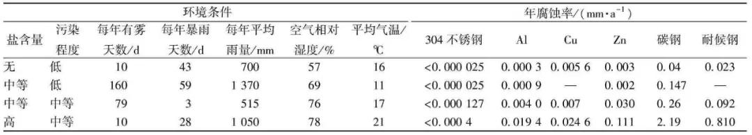 金屬材料的耐腐蝕性能,應(yīng)從兩個方面進行分析研究:一是外部腐蝕環(huán)境,二是金屬材料本體的性能。以沿海地區(qū)腐蝕作用的數(shù)據(jù)為參照,相關(guān)研究通過測試得出不同環(huán)境腐蝕條件下,多種常用建筑金屬材料的腐蝕速率。表1匯總了從幾個沿海地區(qū)腐蝕試驗觀察點測試的結(jié)果,列出了常用建筑金屬材料腐蝕性對比數(shù)據(jù)。
