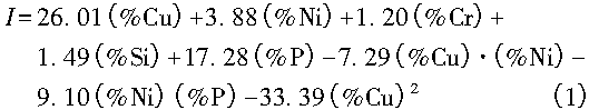 在GB/T 4171—2008標準中,提供了評估低合金鋼耐大氣腐蝕指南(資料性附錄D)。為便于應(yīng)用,Legault和Leckie提出通過化學成分計算耐候指數(shù)的計算式,即:
