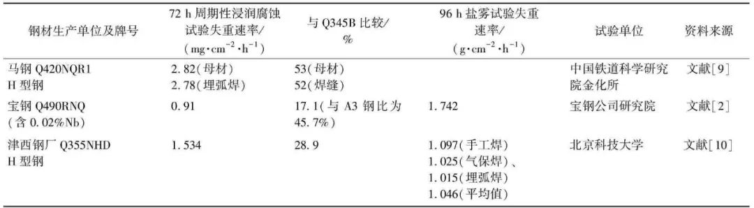 表7列出了目前國產(chǎn)的耐候鋼腐蝕性能(腐蝕失重率)比較。