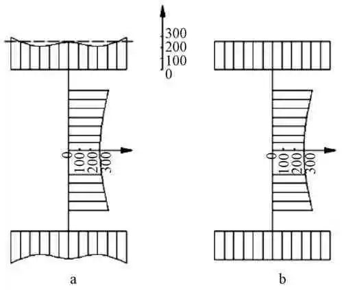 H型鋼與普通工字鋼不同,不僅翼緣加寬,且翼緣的內(nèi)側(cè)沒有坡度。它是用兩個水平軋輥和兩個豎向軋輥同時輥壓成型的(圖2),翼緣和腹板都直接受到壓力。由于截面各部位(翼緣、腹板和交接處等)的厚度、軋制變形量和冷卻條件不同,翼緣和腹板的材料性能會有不同,且翼緣沿寬度和腹板沿高度各部位之間也有差異。不同的成型工藝和不同的取樣位置及測試方法,其材性數(shù)據(jù)和變化規(guī)律也會有些出入。