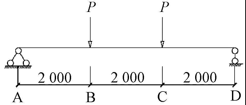 簡支梁的受力簡圖見圖8,有限元模型見圖9。該簡支梁跨度為6 m,在1/3跨和2/3跨處各施加一個荷載為P的集中力。梁用殼單元模擬,梁截面按圖9建立,各單元的材料屬性按表8、表9設(shè)定。