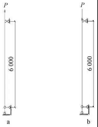 拉、壓桿的計算模型見圖12。該桿件高度為6 m,在桿件頂部施加一個荷載為P的集中力,約束桿件頂部水平向的位移和底部水平及豎向的位移,以此進行桿件受拉強度分析和受壓穩(wěn)定性分析。