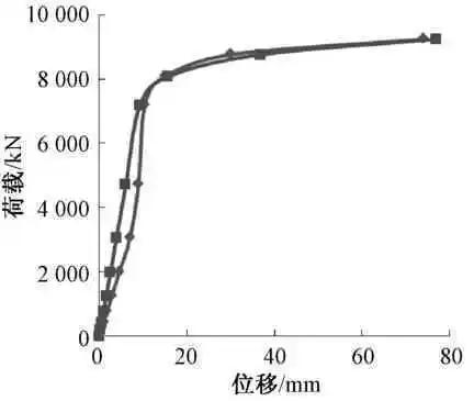 將強度分布不同的兩個試件的荷載-位移曲線比較可知,在桿件失穩(wěn)前,位移相同時,截面強度相同的試件能承受的荷載比截面強度分布不同的試件大。產(chǎn)生這種情況的原因主要是,壓桿的初始缺陷使其在軸心壓力下處于壓彎狀態(tài),而截面強度分布不同的試件在翼緣與腹板交接處的屈服強度較低,此處的正應(yīng)力和剪應(yīng)力卻較大,使桿件截面的承載力降低。但桿件進入塑性階段后,其應(yīng)力會重新分布,此時強度高的部位會承受更多的荷載,使截面整體的承載力提高,這樣截面強度分布不同的兩個試件的穩(wěn)定承載力基本相同。