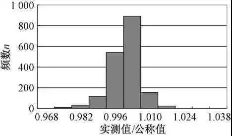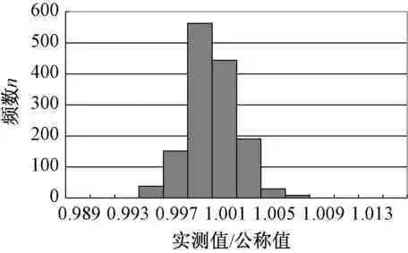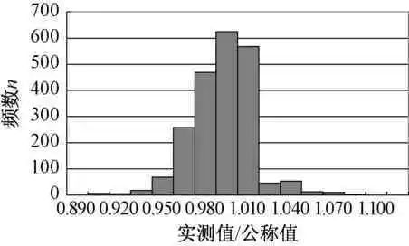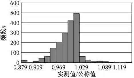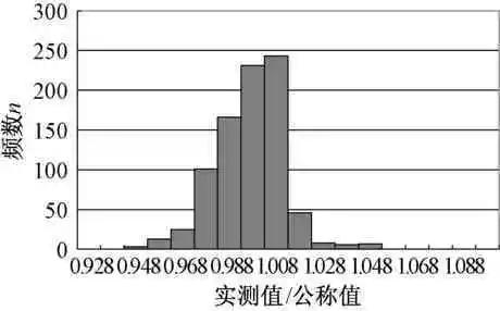 由圖17—圖21可以看出,上述直方圖的形態(tài)接近對數(shù)正態(tài)分布。翼緣厚度6<t≤16 mm時,厚度負偏差情況占統(tǒng)計數(shù)量的絕大多數(shù)。翼緣厚度16 <t≤35 mm時,負偏差的情況有所好轉(zhuǎn)。由于熱軋H型鋼的腹板比翼緣薄,負偏差對腹板的影響比對翼緣的影響大。H型鋼截面高度和翼緣寬度,由于尺寸量級增大,實測值與公稱值之比大多數(shù)在0.995~1.005之間,分布區(qū)間小,數(shù)值穩(wěn)定,統(tǒng)計計算表明其偏差對截面特性的影響很小。