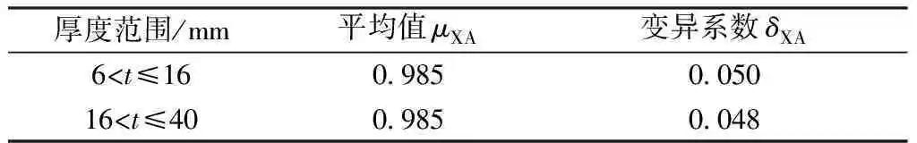 利用普通低合金鋼H型鋼的材性不定性數(shù)據(jù),把相關(guān)文獻中表3.14 的H型鋼材料強度的數(shù)據(jù)作為耐候H型鋼的材性數(shù)據(jù)(標準值比耐候鋼低10 MPa,是偏于安全的)。同時加入津西鋼廠試制耐候H型鋼的數(shù)據(jù),以及本次截面材性不均勻試驗和焊接工藝評定試驗的材性數(shù)據(jù),見表12。