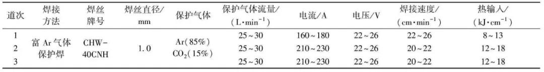 采用富氬氣體保護焊,焊接用氣體為CO2(15%)+Ar(85%),焊接位置為平焊,接頭形式為T形對接(接頭形式及焊接順序同手工電弧焊,參見圖22)。焊接工藝參數(shù)見表16,熔敷金屬力學性能見表17。