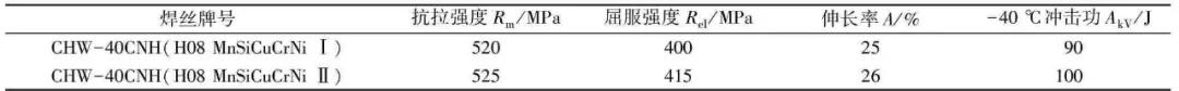 Q355NHD鋼氣體保護焊采用的焊絲牌號為CHW-40CNH,由大西洋焊材公司生產(chǎn),型號為H08 MnSiCuCrNi Ⅱ,φ1.0。