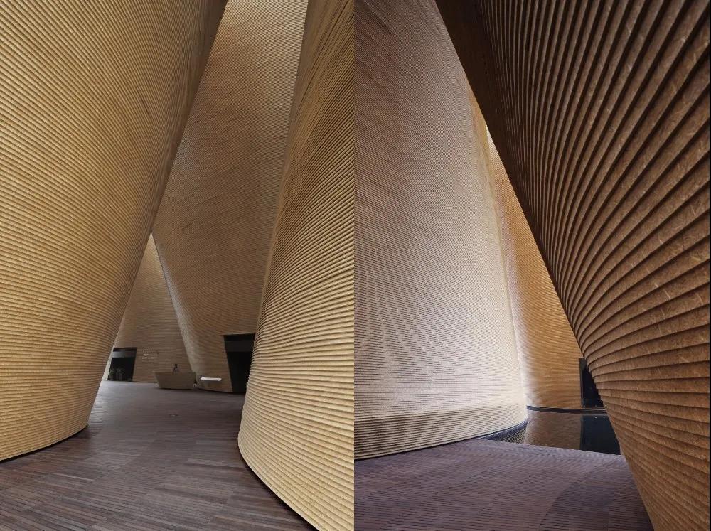 展館由七個不規(guī)則圓筒錯落排布