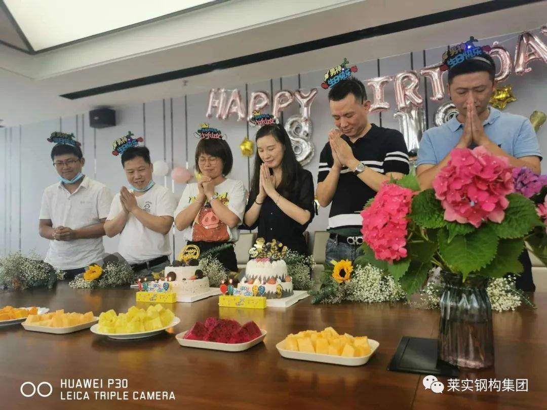 彩色氣球、香甜蛋糕、甘醇紅酒、美麗鮮花、萊實賀卡……企管部的同事們?yōu)樯諘M行了溫馨的布置。大家一起唱著生日歌“祝你生日快樂,祝你生日快樂……”,6名壽星齊聚生日蛋糕前,許下生日愿望,吹滅蠟燭,盡享這幸福溫馨美好的時光。公司副總黃德志最后為大家獻上生日祝福:公司希望讓每一位員工都能感受到萊實的發(fā)展與榮光,希望讓每一位員工都能在萊實這棵大樹下得到幸福生活,希望每一位員工都能與萊實齊心協(xié)力,共創(chuàng)美好未來。
